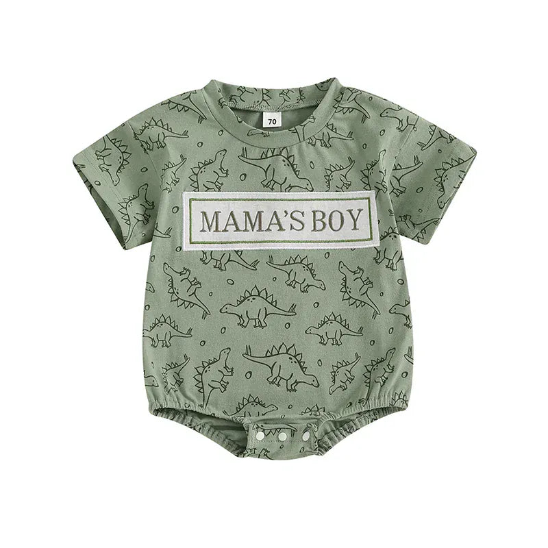 Let your little dino-lover stomp into summer style with this adorable Mama’s Boy romper. Featuring playful dinosaur prints and a bold embroidered letter patch, this short-sleeve bodysuit is made for all-day comfort and cuteness. Crafted from soft, breathable cotton-blend fabric, it’s perfect for casual playdates, warm-weather outings, or just cuddling at home. With snap closures for quick diaper changes, this one-piece is as practical as it is precious.
