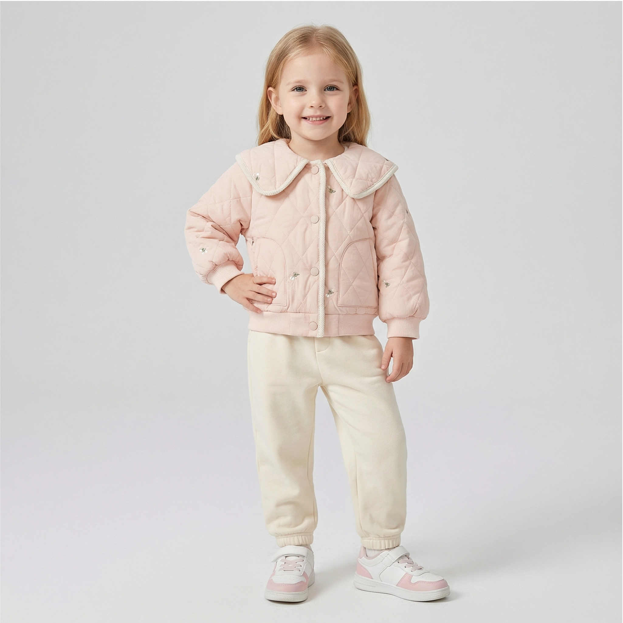 • The Pink Star Jacket: A classic quilted bomber style in soft pink, elevated with an oversized Peter Pan lapel and subtle star embroidery.