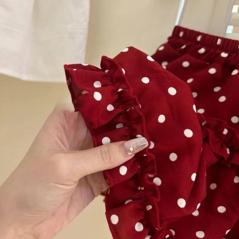 • Enchanting 3-Piece Storybook Set: This is a complete, head-turning outfit. It includes a stunning white eyelet lace (hook flower) tank top, a pair of red polka dot ruffled shorts designed to look like a skirt (pants skirt), and the iconic red polka dot hood with a delicate lace trim.