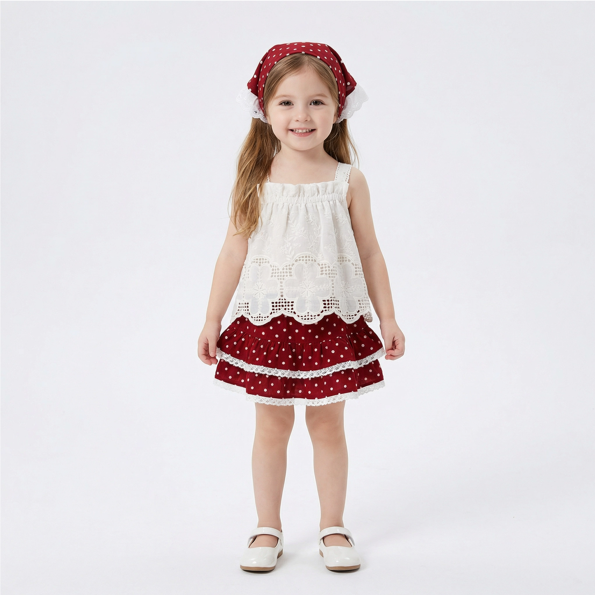 Let her step into her own storybook with "The Little Red," a new summer three-piece set that is the definition of cute. Inspired by the classic tale of Little Red Riding Hood, this outfit blends whimsical charm with beautiful Western style. The set includes a delicate lace tank top, a pair of layered polka pants skirt, and a matching polka dot hood, creating a look that is unforgettable.