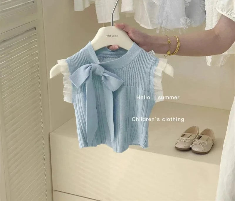 This adorable 2-piece outfit features a sleeveless knitted top with a statement bow and a breezy ruffled skirt, perfect for warm days and special moments. Whether for parties, outings, or playdates, this set adds a touch of sweetness and elegance to your girl's wardrobe.