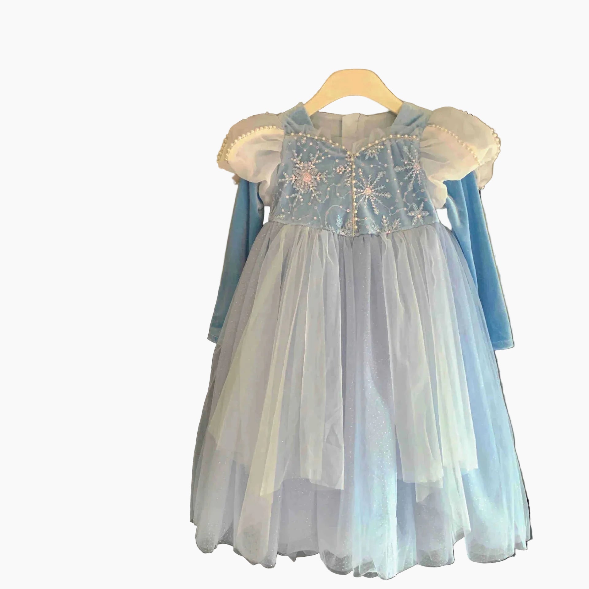 Luxurious Velvet & Tulle Construction:This dress is a symphony of beautiful textures. The long sleeves and bodice are crafted from a soft,thickenedblue velvet, providing warmth and a rich, royal look. This is perfectly contrasted by the light, airy layers of the tulle skirt.