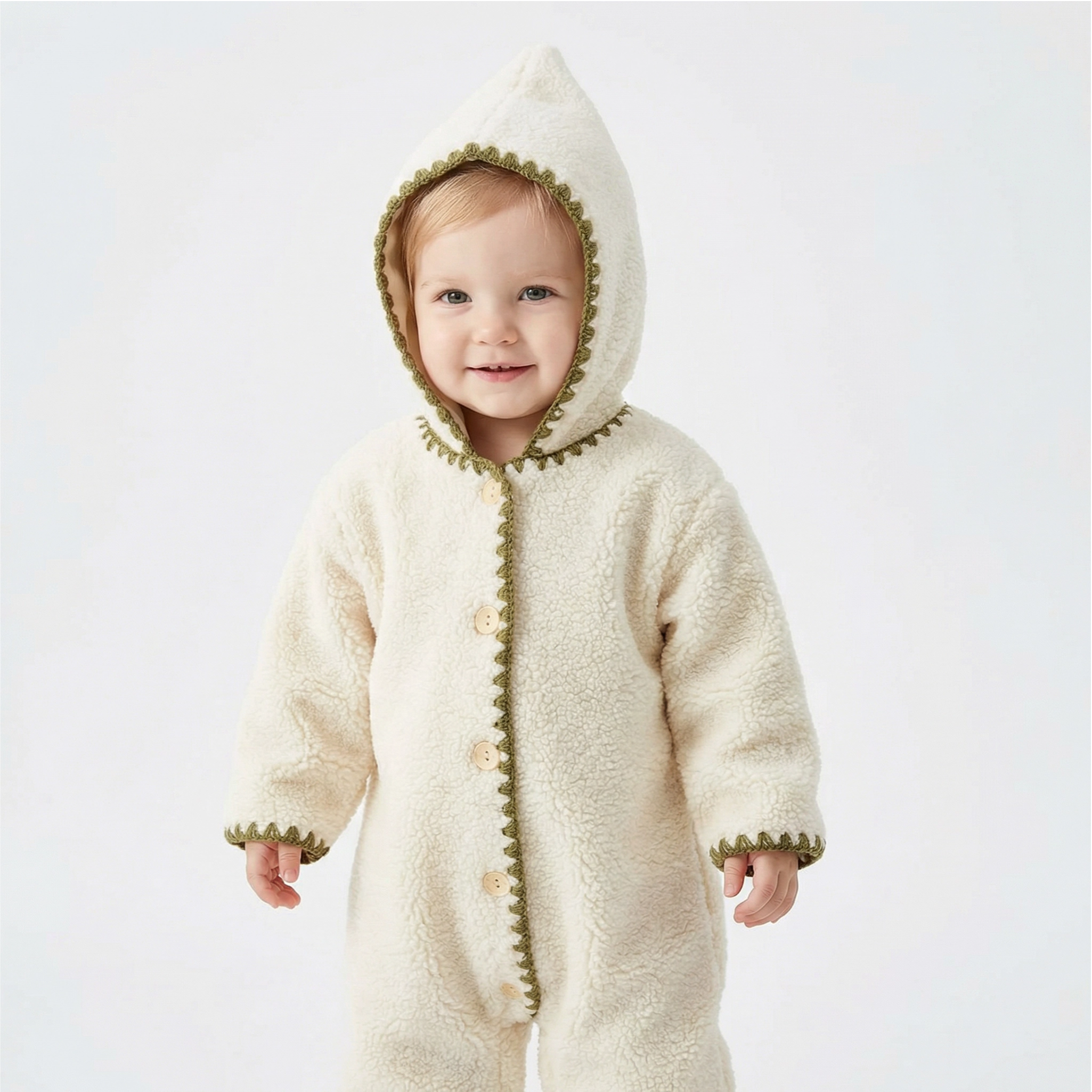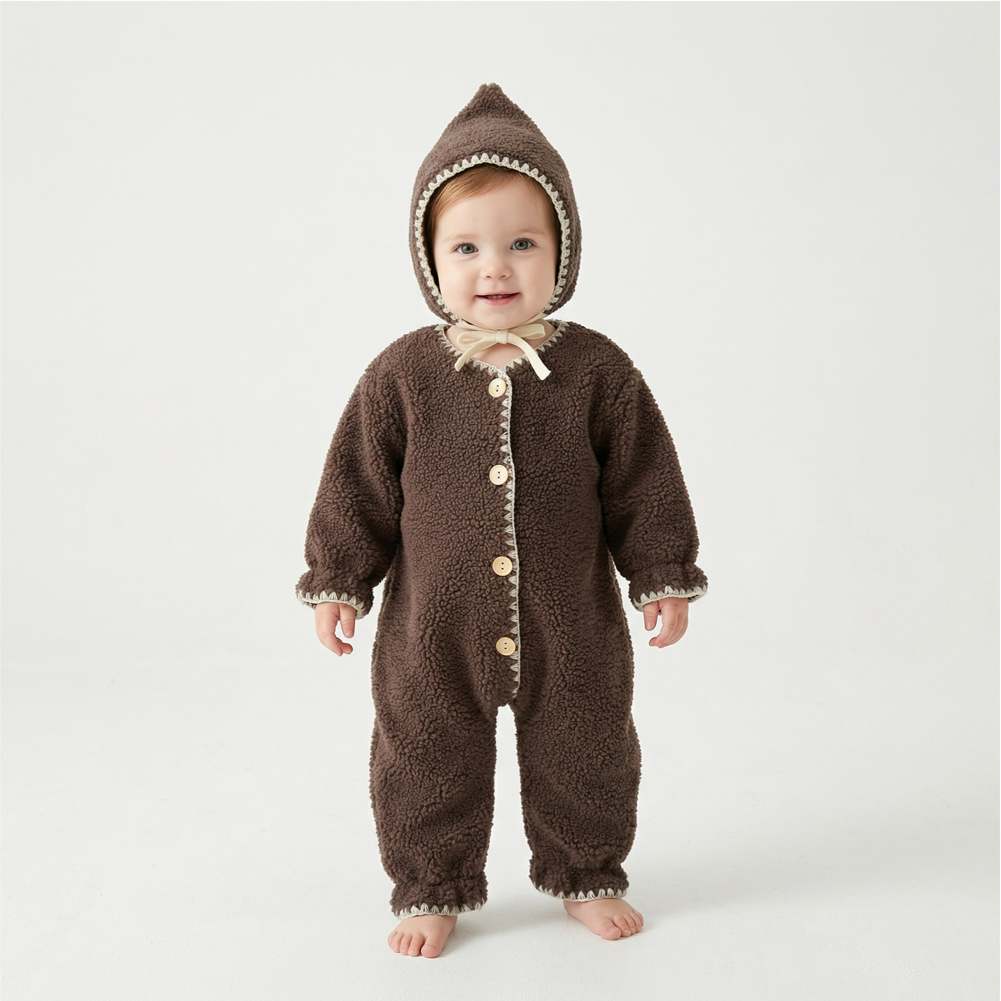 Introducing "The Cozy Cloud," the perfect one-piece outfit for your baby's first autumn and winter. This incredibly soft baby jumpsuit is designed for ultimate warmth and style. Made from a plush velvet-like material, this set, complete with a matching hat, is the ideal climbing clothes for a baby boy or girl, offering a look of simple, modern elegance.